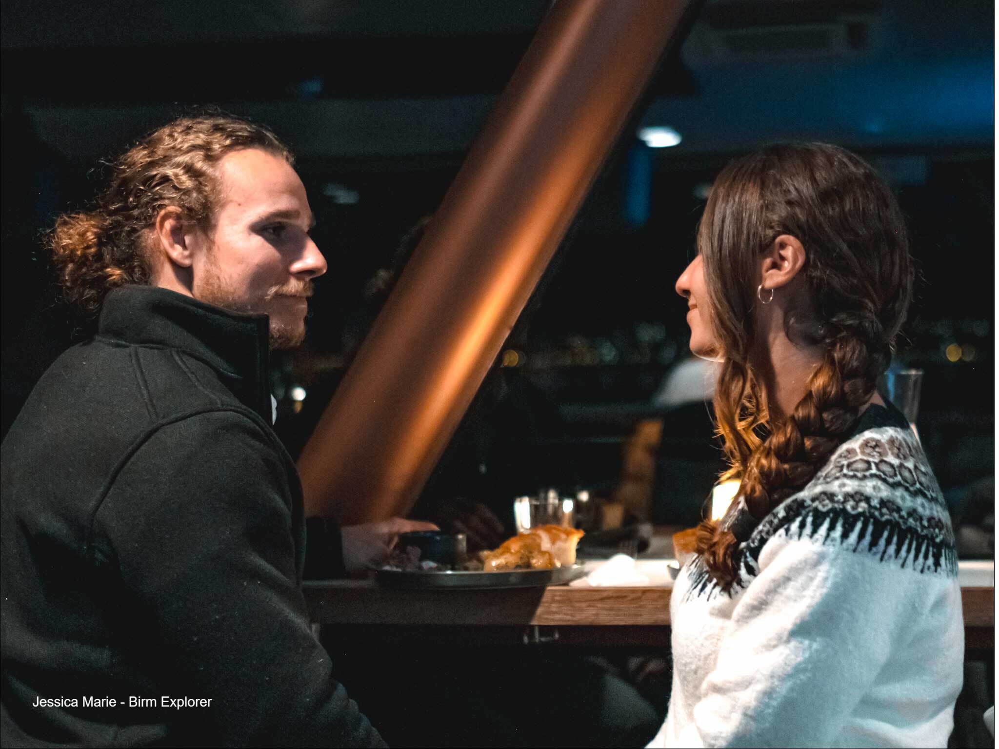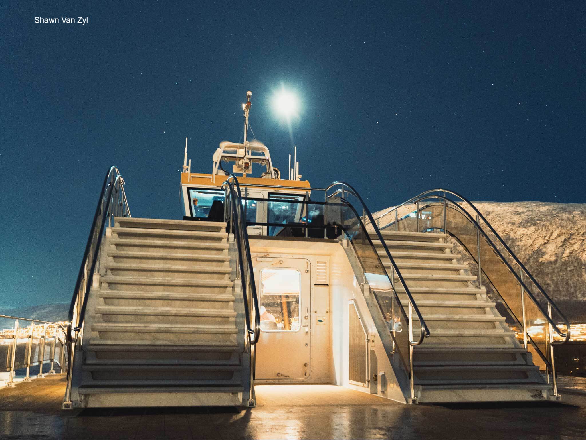 At 18:45 we open the doors of our floating restaurant and soon depart Tromsø in search of the Northern Lights. With our electric motor we will sail silently into the darkness of the Tromsø fjords. Order a local craft beer from Graff or one of our carefully selected wines and settle down at one of the tables by our panoramic windows.